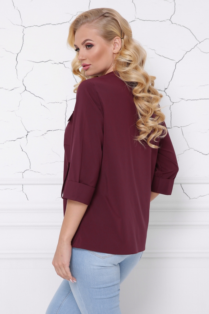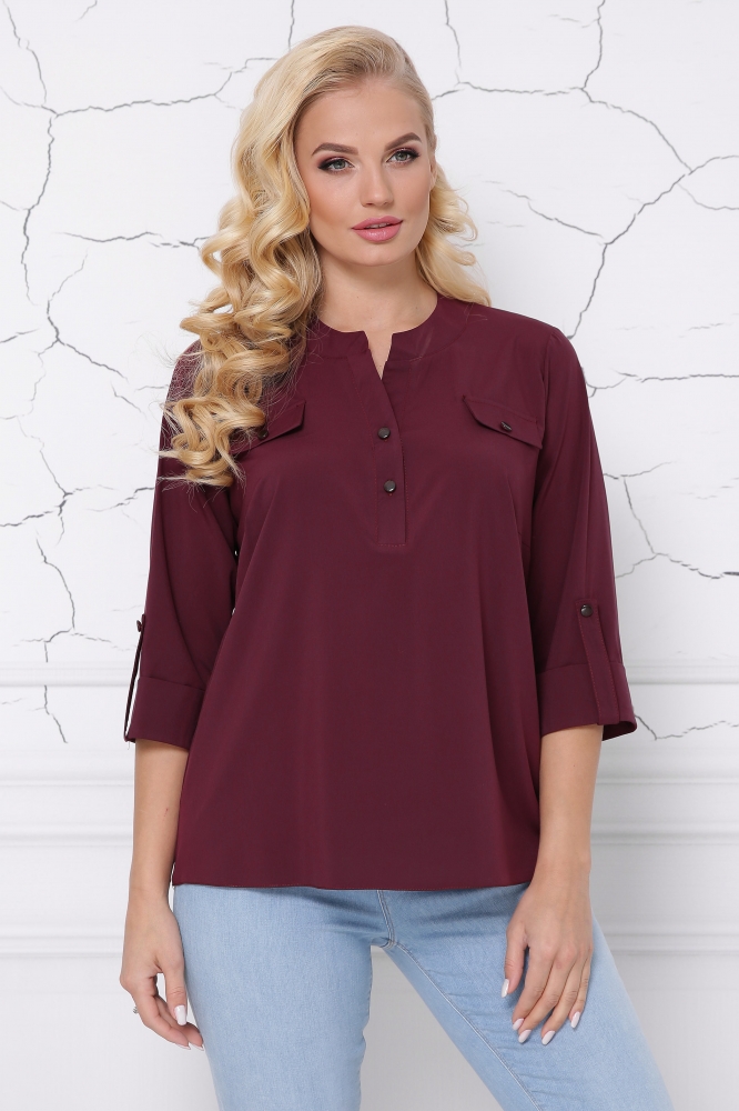 Блуза женская молодежная,с круглым вырезом,планкой до груди.Рукав 3/4 с манжетой и хлястиком.Декором служат пуговицы и клапана на груди.Дина в 48 и 50 р.-68.5 см,52-54 р.-69 см,56 и 58 р.-69.5 см