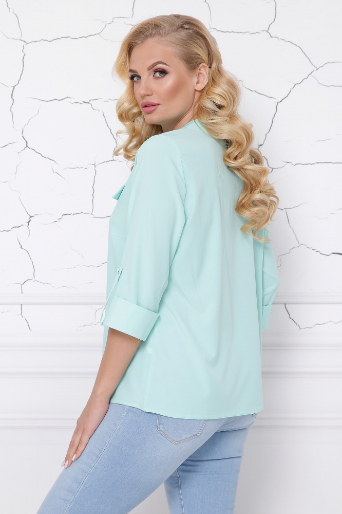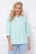 Блуза женская молодежная,с круглым вырезом,планкой до груди.Рукав 3/4 с манжетой и хлястиком.Декором служат пуговицы и клапана на груди.Длина в 48 и 50 р.-68.5 см,52-54 р.-69 см,56 и 58 р.-69.5 см.