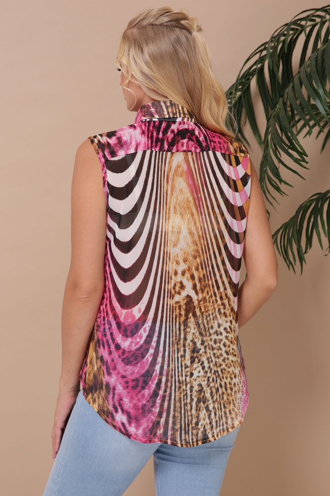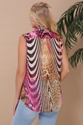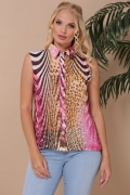 Рубашка-блуза женская,свободного силуэта,без рукавов.Воротник рубашечного типа с острыми концами.Полочка нагрудными вытачками и застежкой планкой на пуговицах.Спинка с двойной плечевой кокеткой,удлиненная по отношению к полочке.Длина изделия 68 см