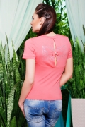 Футболка молодежная,прилегающего силуэта.Рукав короткий с манжетой.Полочка с горловиной округлого выреза.Спинка с кокеткой и разрезом по центру.На полочке сбоку на груди и на кокетке спинки декоративный элемент-бант и наклейка в виде бабочки.Длинна изделия 53 см.