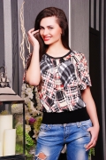Кофта женская сбободного силуэта.Рукав короткий покроя "реглан"с разрезами по средней линии украшенный пуговицами золотого цвета.Горловина округлая со сборкой по полочке,оформленная обтачкой контрастного цвета.Пояс отрезной-двойной в тон обтачки.Длинна изделия 53 см.
