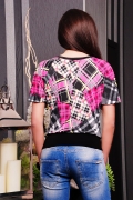 Кофта женская сбободного силуэта.Рукав короткий покроя "реглан"с разрезами по средней линии украшенный пуговицами золотого цвета.Горловина округлая со сборкой по полочке,оформленная обтачкой контрастного цвета.Пояс отрезной-двойной в тон обтачки.Длинна изделия 53 см.