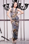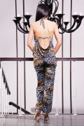 Комбинезон молодежный,полуоблегающего силута.Лиф оформлен присборенным запахом.Под линией груди эластичная декоративная полоса из основной ткани переходит в металлическую застежку украшение.Выше крепятся завязки.На спине из под декоративной эластичной полосы из основной ткани оформлен вырез с драпировкой.Брюки прямые,вннизу на кулиске с завязками.
