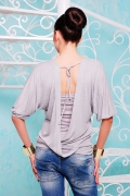 Комплект молодежный,состоящий из двух изделий.Топ собранный вверху на резинку.Кофта с рукавом 3/4 на манжете,образующая сборку.Полочка и спинка с запахом собранные на манжету на поясе.На спинке завязки регулирующие открытость спины.Длинна 65 см.
