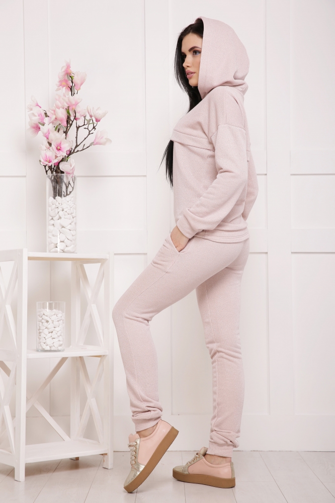 Костюм спортивный молодежный,брюки прямые под манжет с карманами.Кофта с капюшоном со спущенным плечом,рукав под манжет.На полочке и спинке заложена кокетка.Декором полочки служит молния цвета "золото".Длина кофты в 42 р.-66 см,44 р.-66.5 см,46 р.-67 см,48 р.-67.5 см,50 р.-68 см.Длина брюк в 42 р.-105 см,44 р.105.5 см,46 р.-106 см,48 р.-106.5 см,50 р.-107 см
