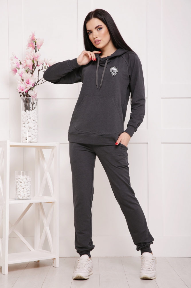 Костюм спортивный,молодежный,брючный.Кофта с капюшоном и рукавом реглан,рукав под манжет.На полочке кофты карман "кенгуру"круглой формы по низу.Кофта под манжет,брюки прямые с прямым карманом и манжетом по низу.Длина брюк в 42 р.-104 см,44 р.-104.5 см,46 р.-105 см,48 р.-105.5 см,50 р.-106 см.Длина кофты в 42 р.-68 см,44 р.-68.5 см,46 р.-69 см,48 р.-69.5 см,50 р.-70 см.