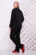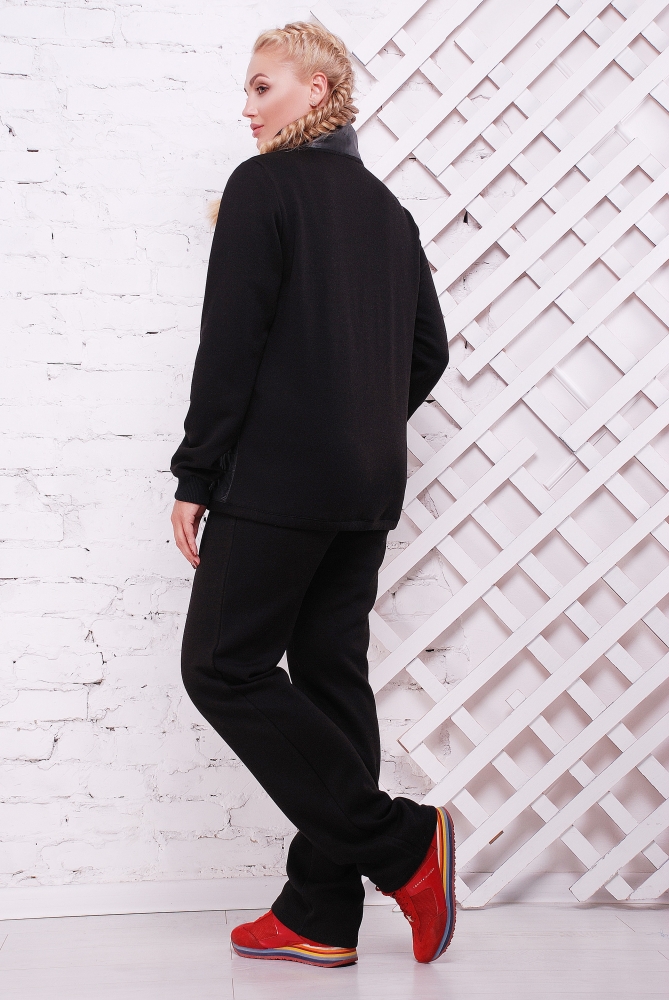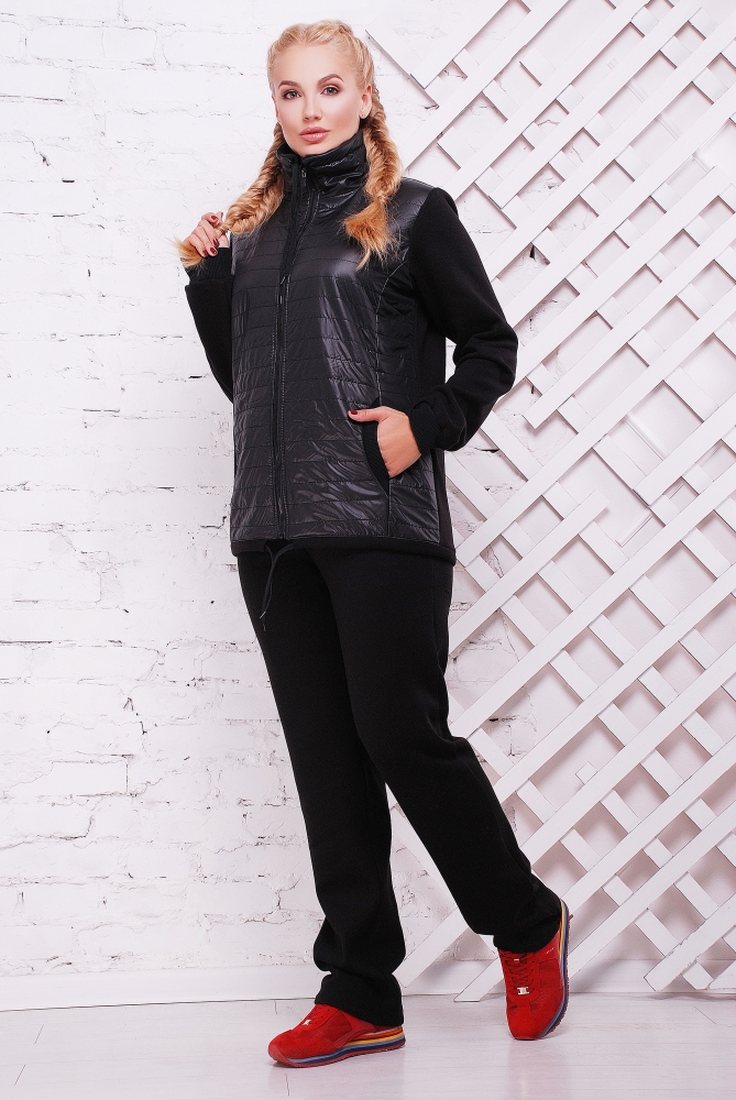 Костюм спортивный,брючный.Кофта прямого приталенного кроя с подрезными бочками.На кофту настрочена плащевка,воротник стойка.В воротник и низ кофты вставлен шнурок.Манжет рукава под резинку.Брюки прямые.