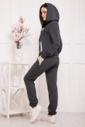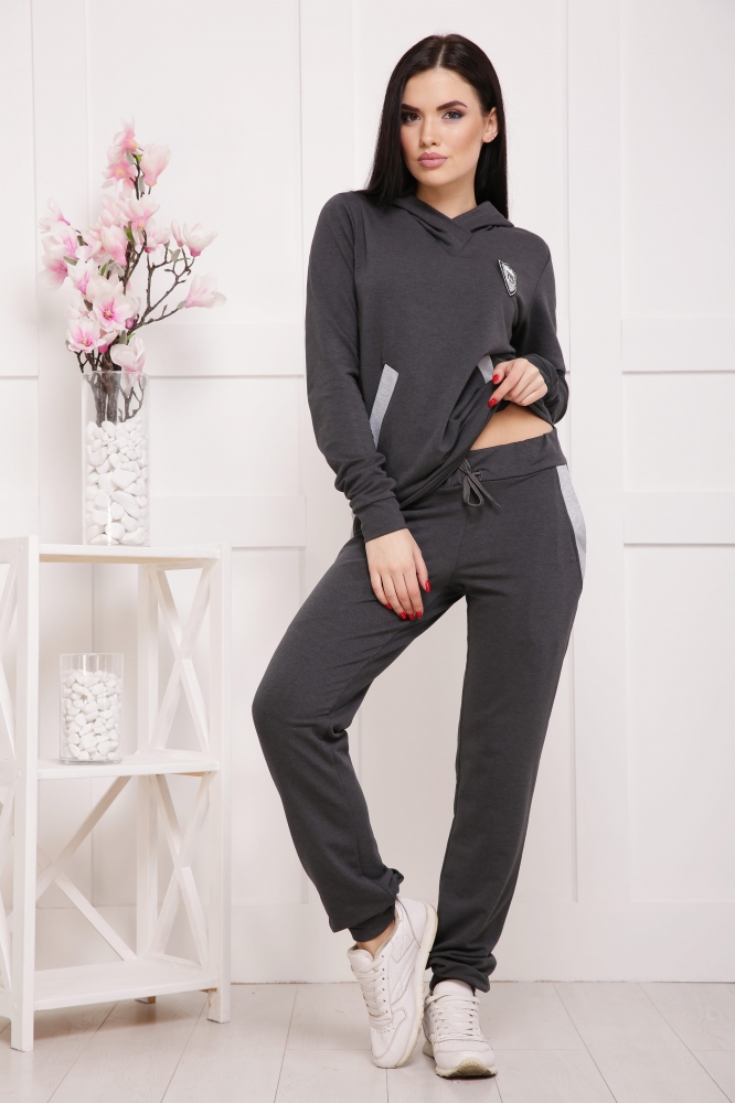 Костюм молодежный,спортивный из двухнитки.Кофта с втачным рукавом и манжетами,низ кофты с манжетой.Кофта с капюшоном и V-образной горловиной.На полочке карманы листочки из отделочной ткани.Брюки на манжете с карманами из отделочной ткани.Пояс под резинку.Длина брюк 42-44 р.-108 см,46-48 р.-109 см,50-52 р.-110 см.Длина кофты 42-44 р.-66.5 см,46-48 р.-67 см,50-52 р.-68 см