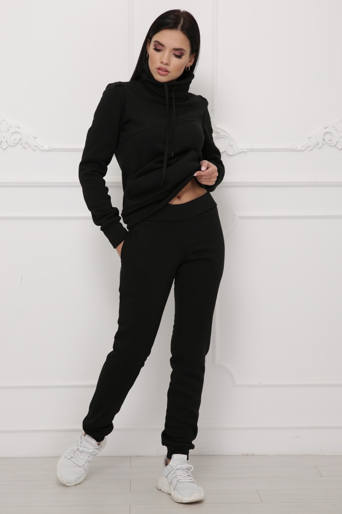 Костюм спортивный молодежный.Кофта приталенного силуэт с ассиметричными линиями на полочке и вертикальными рельефами в которых расположены карманы.На рукаве заложены две склады.Воротник "хомут"с драпировкой.Длина кофты в 42 и 44 р.-68 см,в 46 р.-69 см,в 48 и 50 р.-70 см.
