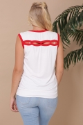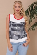 Майка женская полуприлегающего силуэтаГорловина полочки округлая,по центру полочки наклейка.Низ собран на двойной пояс-манжет.Длина изделия 55 см
