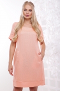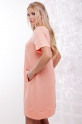 Платье молодежное ботальное прямого силуэта.Рукав короткий с широким притачным манжетом.Спинка со средним швом на застежку молнию.Горловина округлого выреза.Полочка с рельефами и карманами в рельефах.По низу платья притачная широкая манжета.Длина изделия 80-86 см.Рост модели 174 см