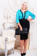 Платье женское,ботальное,полуприлегающего силуэта,зауженое к низу.Рукав длиной 3/4.Спинка со средним швом и застежкой на потайную молнию.Платье отрезное по линии талии из контрастных тканей.Полочка с округлым вырезом горловины,по линии талии украшена кружевом.Длина изделия 105 см.Наценка на размеры 60-62 +50 гр.