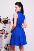 Платье молодежное,отрезное по линии талии с юбкой,без рукавов.Платье с воротником и планкой с пуговицами по переду.Полочка и спинка с треугольниками по бокам,которые могут завязываться как на спинке так и на полочке.Юбка со встречными складами,по 3 склады на полочке и спинке,в боковых швах карманы.Длина в 42 р.-87 см,каждый следующий размер увеличивается на 1.5 см.