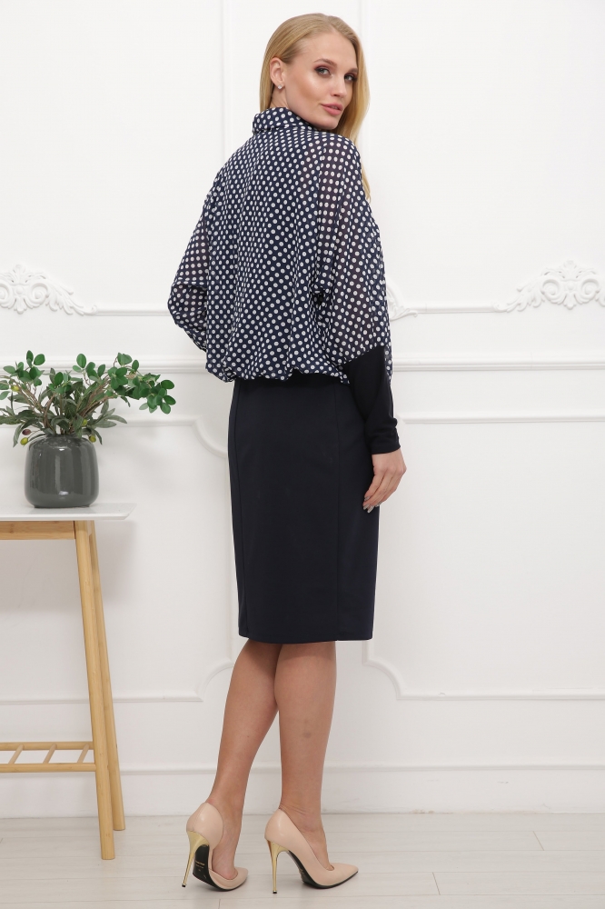 Платье женское,ботальное,свободного силуэта.Платье отрезное по линии талии,юбкапрямая зауженная.Верхняя часть платья из воздушного принтованого шифона покроя "летучая мышь"с небольшой сборкой по талии.Рукав 3/4 с широким манжетом в цвет юбки.Под низом шифона эластичная облегающая майка,которая является неотемлемой частью лифа.Горловина округлого выреза с притачным воротником.Длина изделия 105 см.