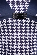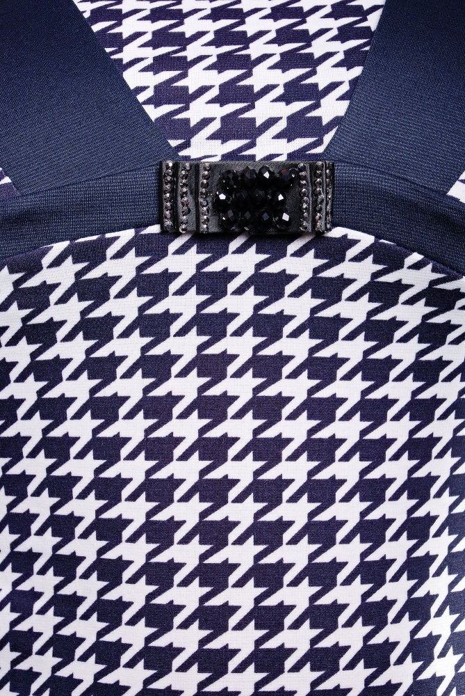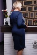 Платье женское, батальное, прилегающего силуэта. Платье с фигурным вырезом на горловине. По полочке и спинке заложены фигурные рельефы. На полочке платья вшит фигурный пояс, под грудью задекорированный брошью. В платье вставлена отделочная ткань "гусиная лапка". Рукав длинный.