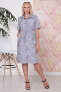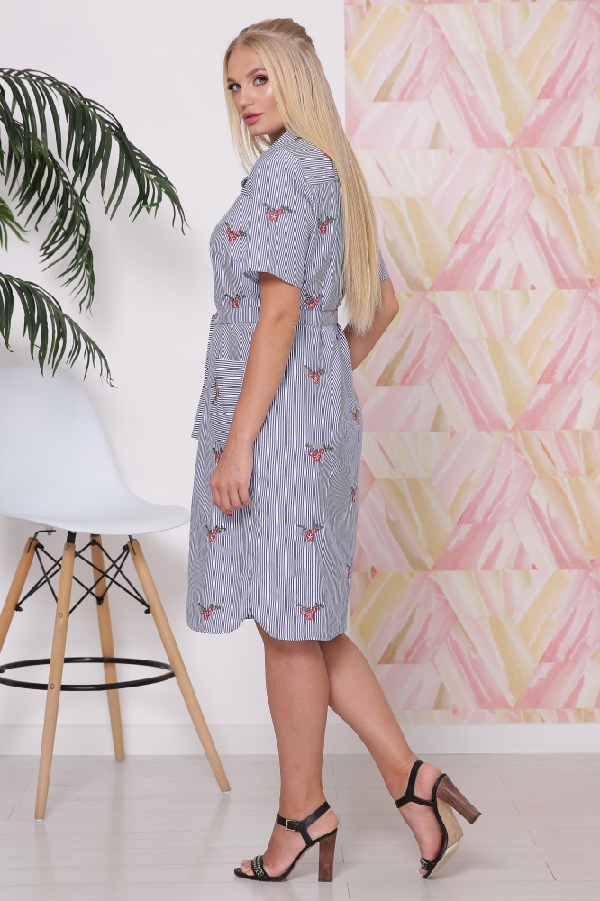 Платье ботальное свободного силуэта рубашечного фасона.Платье с воротником и планкой по передуПо полочке накладные карманы,по бокам разрезы с закруглениями.Платье с коротким рукавом и кокеткой по полочке и спинке.Платье под пояс.Длина в размерах 48 и 50-109.5 см,р. 52 и 54-110 см,р.56 и 58-110.5 см.