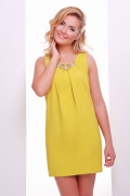 Платье молодежное,свободного силуэта, без рукавов с круглым вырезом по горловине украшенной золотой фурнитурой.По горловине заложены три склады,одна встречная по центру полочки и две фигурные.По спинке застежка на пуговицу и щелевидный разрез.Длина в 42 р.-78 см,с каждым размером длина увеличивается на 2 см.