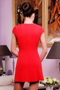 Платье молодежное трапецевидного силуэта,длинна мини.Рукав короткий.Спинка с рельефами и средним швом с молнией.Полочка с рельефами переходящие в боковые швы.Горловина "лодочка" украшенная "золотым колье"с камнями.Длинна изделия 78 см.Рост модели 170 см.