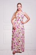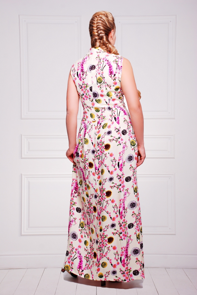 Платье женское,без рукавов,воротник стойка.Спинка со средним швом.Верх модели плотно облегает фигуру,а к низу плавно расширяется.Юбка клешеная с бантовыми складами и боковыми карманами,длинной maxi.Приталенный силуэт эффектно подчеркнут широким поясом-корсажем.Полочка с фигурными рельефами и застежкой-планкой на трех пуговицах.Для удобства одевания в боку застежка-молния.