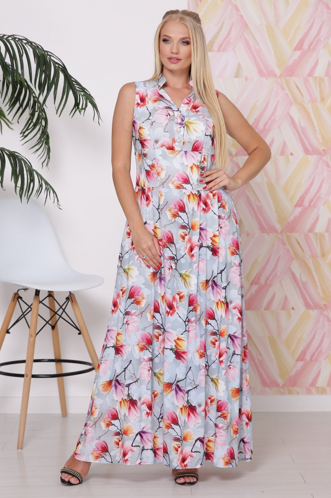 Платье женское,без рукавов,воротник стойка.Спинка со средним швом.Верх модели плотно облегает фигуру,а к низу плавно расширяется.Юбка клешеная с бантовыми складами и боковыми карманами,длинной maxi.Приталенный силуэт эффектно подчеркнут широким поясом-корсажем.Полочка с фигурными рельефами и застежкой-планкой на трех пуговицах.Для удобства одевания в боку застежка-молния