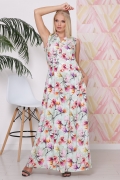 Платье женское,без рукавов,воротник стойка.Спинка со средним швом.Верх модели плотно облегает фигуру,а к низу плавно расширяется.Юбка клешеная с бантовыми складами и боковыми карманами,длинной maxi.Приталенный силуэт эффектно подчеркнут широким поясом-корсажем.Полочка с фигурными рельефами и застежкой-планкой на трех пуговицах.Для удобства одевания в боку застежка-молния