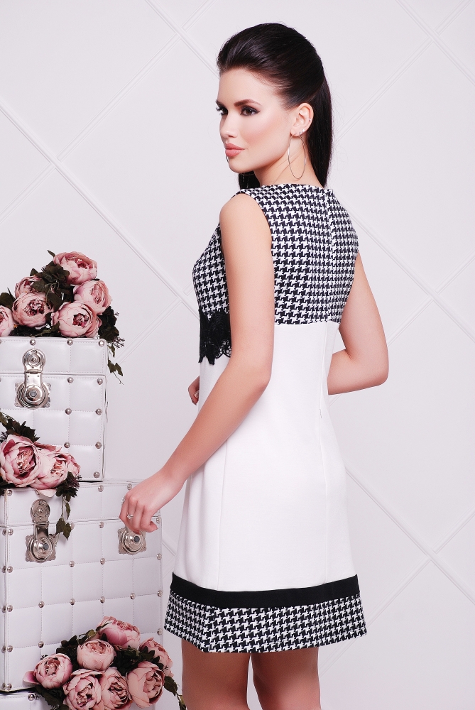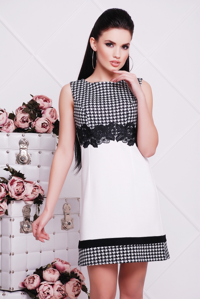 Платье молодежное прямое без рукавов с вырезом "лодочка"по горловине.Платье состоит из трех тканей.Кокетка и низ полочки и спинки из гусиной лапки.Рельефы на полочке.Декором служит широкое выбитое кружево черного цвета пришитое под грудью.Длина в 42 р.-85 см,каждый следующий размер увеличивается на 1.5 см.