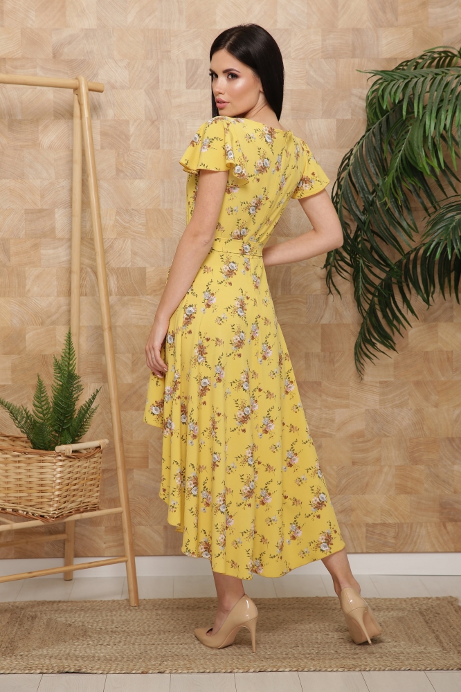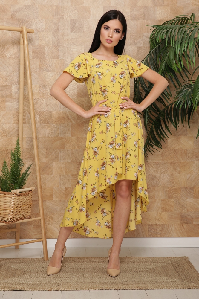 Платье молодежное,верх прилегающего силуэта,с рельефами,отрезная юбка-полусолнце.Низ юбки по переду короче по спинке длинее.Рукав короткий-крылышко.По центру спинки шов и потайная молния.Длина платья по центру спинки в 42 р.-122 см,44 р.-123 см,46 р.-124 см,48 р.-125 см,50 р.-126 см.Длина изделия от талии до низа юбки по спинке в 42 р.-86 см,длина по переду отталии до низа в 42 р.-49 см,к каждому следующему размеру добавляется 1 см.