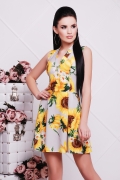 Платье молодежное прилегающего силуэта,отрезное по линии талии и юбкой со встречными складами.Платье без рукавов,с фигурными рельефами и V-образным вырезом по горловине.Юбка трапецевидная с застрочеными в верху складами.На спинке по центру шов и потайная молния.