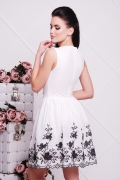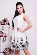 Платье молодежное отрезное по талии с юбкой "татьянкой"без рукавов.Вырез по горловине"лодочка".На полочке фигурные рельефы,по центру спини потайная молния.Платье из батиста по низу юбки вышивка с выбитыми цветами.Длина в 42 размере 88 см,каждый следующий размер увеличивается на 1.5 см.