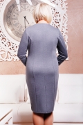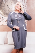 Платье женское, батальное, прилегающего прямого силуэта. По переду и спинке платья заложены фигурные рельефы. Платье с длинным рукавом. На полочки платья вшиты фигурные клапаны с отделочной ткани. Платье декорировано планкой, в которую вшиты "белые домики", через которые продета "вермишель".
