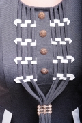 "Вермишель" - декоративная отделка вшита в горловину платье, фиксирующаяся перетяжкой с камнями, что предает платью необычайности и служит аксессуаром. Кроме пряжки из аксессуаров пришиты пуговицы цвета золота. Рекомендуемый рост - 164-170 см.