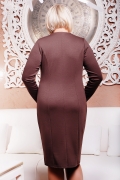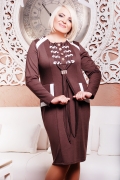 Платье женское, батальное, прилегающего прямого силуэта. По переду и спинке платья заложены фигурные рельефы. Платье с длинным рукавом. На полочки платья вшиты фигурные клапаны с отделочной ткани. Платье декорировано планкой, в которую вшиты "белые домики", через которые продета "вермишель".