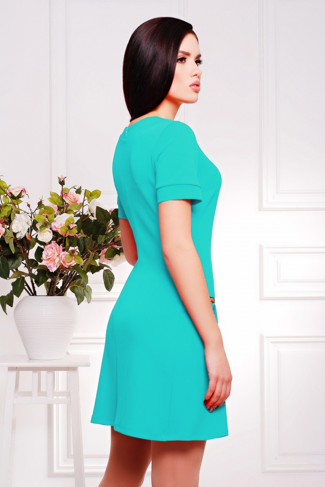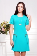 Платье молодежное полуприлегающего силуэта.Рукав короткий с манжетой.Спинка со средним швом на застежку-молнию.Горловина округлого выреза,обработанная отрезной обтачкой.Платье расширенное к низу со складкой по линии бедер,с обманкой кармана на молнии.Длина платья в 42 размере 80 см.
