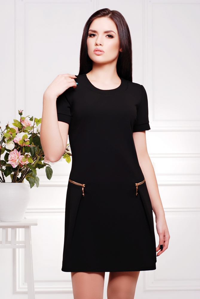 Платье молодежное полуприлегающего силуэта.Рукав короткий с манжетой.Спинка со средним швом на застежку-молнию.Горловина округлого выреза,обработанная отрезной обтачкой.Платье расширенное к низу со складкой по линии бедер,с обманкой кармана на молнии.Длина платья в 42 размере 80 см