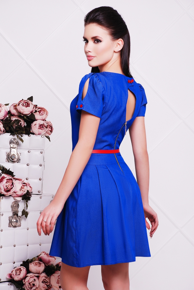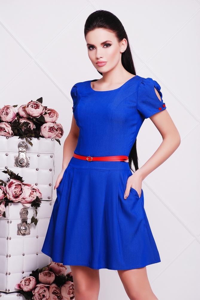 Платье молодежное,отрезное по талии,с коротким рукавом.Полочка и спинка с отрезным поясом,юбка с односторонними складами по полочке и спинке.В боковых швах юбки карманы.Полочка с круглым вырезом горловиы и фигурными рельефами.На спинке молния цвета "золота",фигурный вырез и ассиметричная застежка на трех пуговицах.Рукав со сборкой на запах.Пояс входит в стоимость платья.Длина в 42 размере -87 см,каждый следующий размер увеличивается на 1.5 см