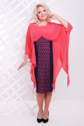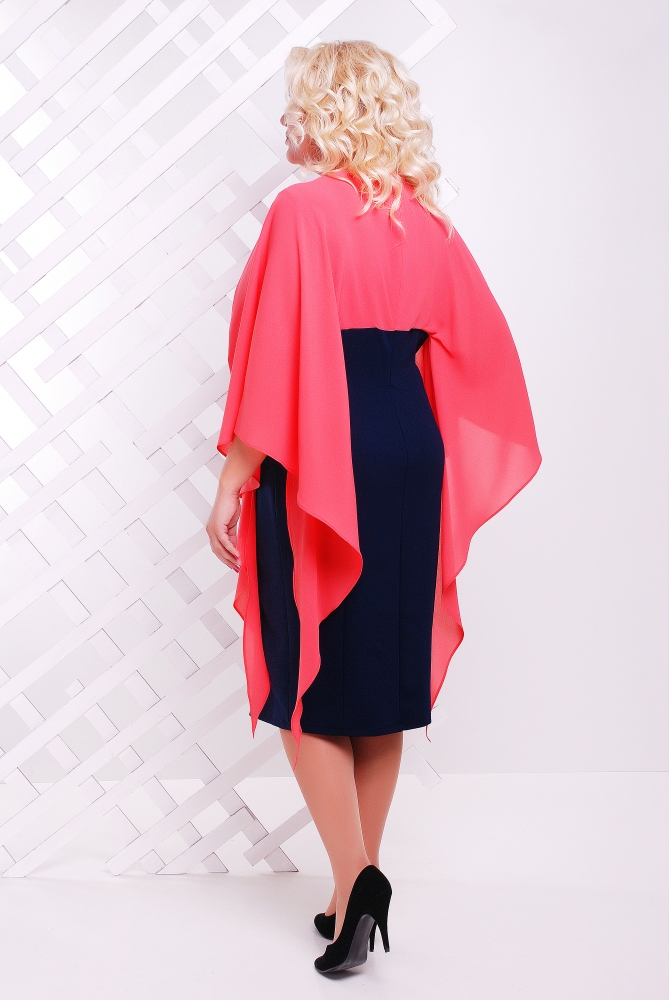 Платье женское,ботальное,прилегающего силуэта,зауженное к низу.Спинка со средним швом и застежкой на потайную молнию,рельефы приталивают и зауживают изделие к низу.Кокетка из креп-шифона под линией груди.По линии кокетки втачана отлетная пелерина,переходящая в рукава.Горловина круглая.Верхняя часть полочки из креп-шифона.По центру вставка из кружевного полотна набранного на креп-шифон.Пелерина переходит в рукава,удлиненные к линии низа изделия