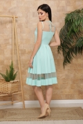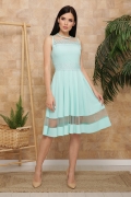 Платье молодежное отрезное по талии с юбкой полусолнцем и складами по талии.По полочке и спинке кокетка из сетки.По низу юбки сетка.Декором служит кружево на полочке,в боковом шве вшита молния.Длина по центру спинки в 42 р.-93 см,каждый следующий размер удлиняется на 1 см.