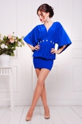 Платье молодежное свободного силуэта.Верх отрезной по линии груди со сборкой,рукав длиной 3/4 покроя "летучая мышь".Широкий фигурный пояс украшен камнями.Средняя часть платья отрезная с легкой сборкой сверху и снизу.Юбка короткая облегающая.Длина изделия 90 см.Рост модели 170 см.