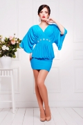 Платье молодежное свободного силуэта.Верх отрезной по линии груди со сборкой,рукав длиной 3/4 покроя "летучая мышь".Широкий фигурный пояс украшен камнями.Средняя часть платья отрезная с легкой сборкой сверху и снизу.Юбка короткая облегающая.Длина изделия 90 см.Рост модели 170 см.