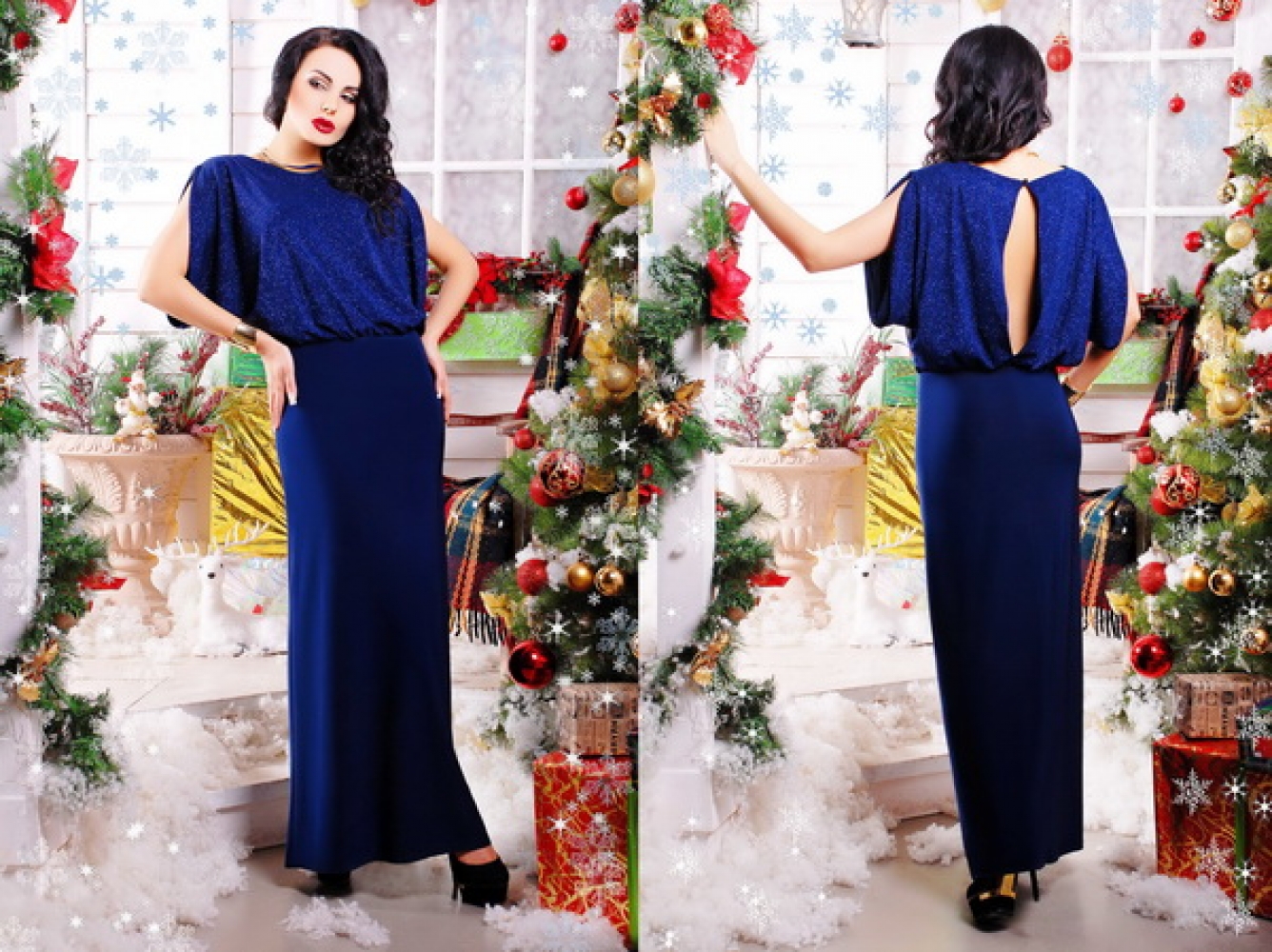 Платье женское молодежное, длиной макси. Верхняя часть двойная из отделочной ткани, широкого покроя со сборкой по линии талии, придающей легкость и изысканность изделию. Рукав с заниженными плечами и глубоким вырезом. Спинка открытая с запахом. Под низ платья можно надеть майку на брителях, идущую в комплекте.