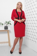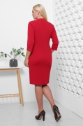 Платье женское, батальное, прилегающего прямого силуэта. На спинке вставлена потайная молния. Полочка платья выглядит в виде жакета и юбки. По центральной части полочки заложены мелкие защипы. На талии платья вшит пояс на котором закреплена красивая брошь. Рукав 3/4. Длина изделия 102 см.