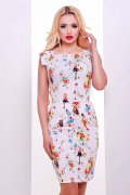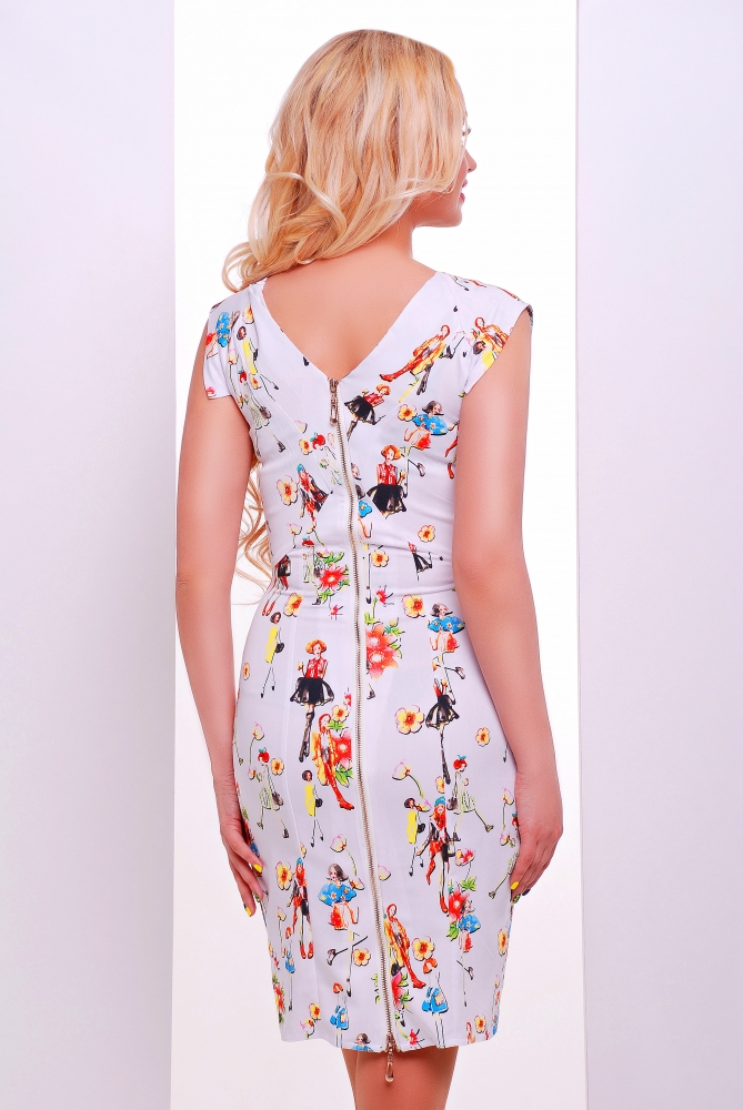 Платье молодежное прямое,прилегающего силуэта.Платье отрезное по талии с круглой горловиной в которой заложены выточки в виде склад.Рукав короткий.На юбке полочки присутствуют элементы баски.Спинка с V-образным вырезом и двухсторонней молнией по центру платья.Длина изделия от плеча 42 р-88 см,44 р-89.5 см,46 р-91 см,48 р-92.5 см,50 р-94 с