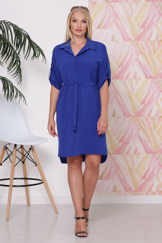 Платье ботальное свободного силуэта с рукавом 3/4.На рукаве хлястик на пуговице.Воротник рубашечный.Платье под пояс,низ платья с разным уровнем.По бокам разрезы с закруглениями.Длина р.48 и 50-110 см,р.52и54-110.5 см,р.56 и 58-111 см.