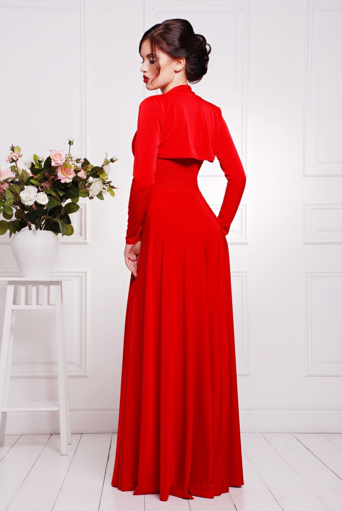 Комплект(платье+болеро)молодежный.Платье полуприлегающего силуэта,на регулируемых бретелях.Спинка собрана на резинку,лиф присборен,от юбки-солнце отделен широким втачным поясом,декоративно завязанным узлом.Длина изделия 150 см.Рост модели 170 см.
