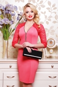 Платье молодежное, прилегающего силуэта.Рукав длиной 3/4 из ажурного кружева.Спинка с отрезной широкой кокеткой V-образной формы из кружева.Полочка с V-образной горловиной декорированной молнией регулирующей вырез лифа.На полочке отрезные кокетки из кружева.Конец молнии украшен фурнитурой.Длина в 42 р.-95 см,в 44 р.-96 см,в 46 р.-97 см,в 48 р.-98 см,в 50 р.-99 см