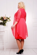 Платье женское батальное полуприлегающего силуэта.Платье из комбинации кружева,шифона и крепа.Верхняя часть-кокетка полочки и спинки двойные,рукава из кружева.Горловина округлая с V-образным вырезом украшенная декоративной брошью.Длина изделия 100 см.