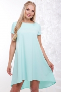 Платье молодежное,свободного силуэта.Рукав короткий.Горловина-лодочка,по спинке и полочке отрезная кокетка.Платье расширенное к низу с ассиметричным подолом,удлиненное по спинке.