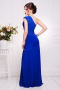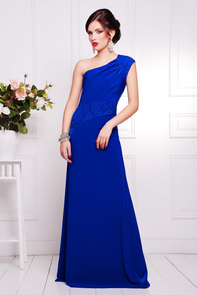 Платье молодежное,прилегающего силуэта.Платье с ассиметричным вырезом горловины,на одно плечо.Лиф задрапированный,придающий объем груди.Спинка и широкий пояс полочки двойной,из гипюра и микромасла.Юбка отрезная длинная,клеш.Длина изделия 150 см.Рост модели 170 см.