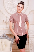 Рубашка молодежная прилегающего силуэта.Рукав короткий с манжетой на 2-е пуговицы.Спинка со средним швом и рельефами.Воротник рубашечного типа двойной из отделочной и основной ткани,с острыми концами скрепленные между собой пуговицей.Полочка с рельефами и баской по низу,выделенные кантом из отделочной ткани.Застежка-планка на пуговицах,нижний край полочки слегка закруглен.На баске сбоку пришита фурнитура цвета золота.Дополнением рубашки является двухцветный галстук,застегивающийся на изящную перетяжку.Длина изделия 60 см.