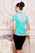 Рубашка молодежная,полуприлегающего силуэта.Рукав короткий.Воротник стойка.Полочка на застежку-планка на пуговицах,с кокеткой из гипюра,с рельефными швами.Внизу пришита надпись цвета золота.Спинка с фигурной кокеткой и баской из гипюра,и отлетной баской в виде рюши из основной ткани украшенная бантиком.Длина изделия 55 см.Рост модели 170 см..